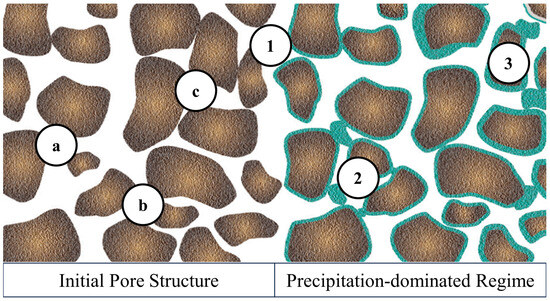 Schematic illustration of the effect of the precipitation process on pore structure. The brown area represents solid particles (e.g., quartz sand), while green coatings are solid-phase precipitation.