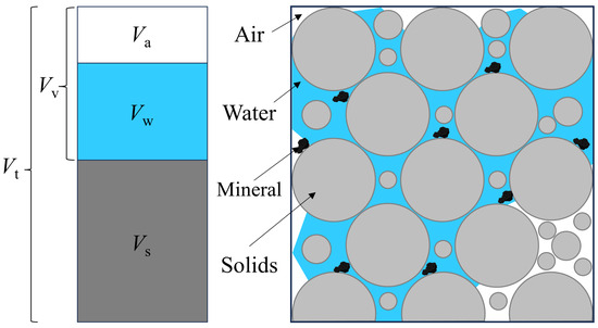 Phase relationship diagram of a cross-section of REV-scale porous media, where Vt is the total volume, Vv is the void volume which equals the water volume Vw under fully saturated conditions, and Vs is the volume of solid particles and precipitated Fe.