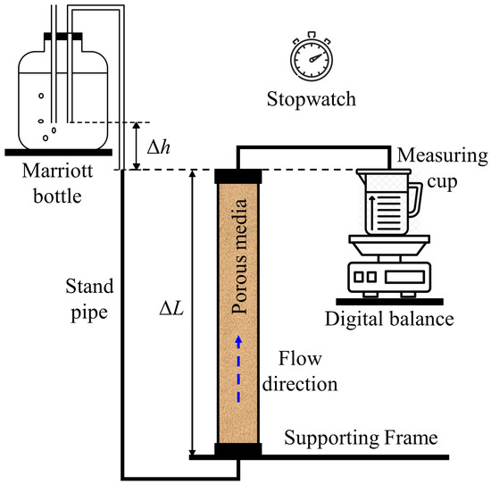 Permeability is a REV-scale seepage property that reflects the ability of fluid to transport through porous media [32,33]. As illustrated in Figure 10, the intrinsic permeability k of precipitation-dominated porous media can be calculated using Darcy’s Law (see Equation (6)), which quantifies a linear relationship between discharge rate and hydraulic gradient in a porous-media-filled column during constant laminar flow [117]: