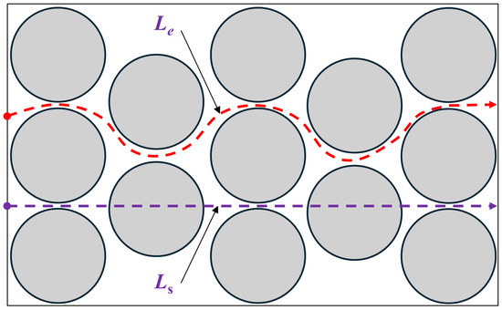 Schematic illustrating the concept of tortuosity in a REV, where Le is the effective length of a flow channel, and Ls is the straight-line distance through a porous media. Note that grey circles represent solid particles in the graphical representation.