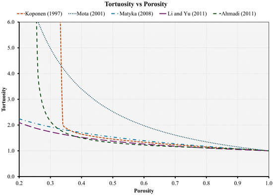 Subsequently, Mota et al. [142] presented a semi-analytical relationship between tortuosity and porosity, particularly for spherical particles: