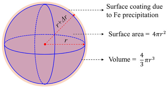 Characterizing the evolving reactivity in porous media is also important when porous media evolves with the oxidative precipitation of Fe(II), and reactivity is often quantified based on the surface area. The simplest assumption is that mineral precipitates uniformly coat solid particles. Hence, the specific surface area of a spherical particle (see Figure 13) is only related to its radius r: