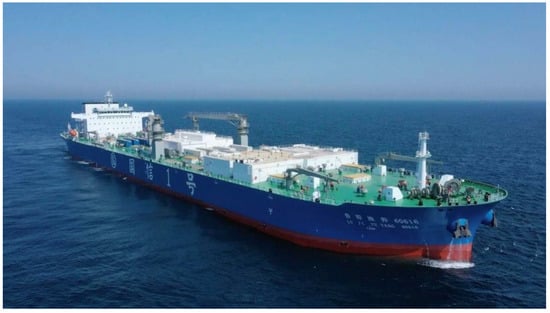 “Conson No. 1”, an intelligent marine aquaculture vessel designed by the Fishery Machinery and Instrument Research Institute of the Chinese Academy of Fishery Sciences, commenced operations on 20 May 2022 (Figure 1). It has a total length of 249.9 m and a width of 45 m, featuring 15 aquaculture tanks. The annual production capacity for large yellow croakers is approximately 3700 t, with a stock density of around 18 kg/m3 [17]. This study focuses on assessing the CF of the entire life cycle process of large yellow croaker farming on board “Conson No. 1”. The functional unit considered is 1 kilogram of fresh large yellow croakers delivered to a wholesaler.
