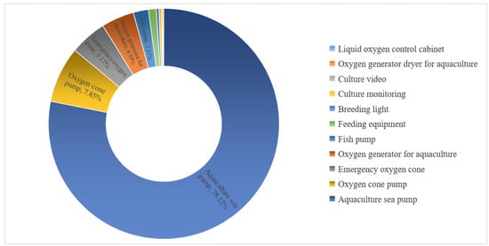 The primary source of a high CF in terms of energy consumption in fish farming on board was electric power required for the aquaculture equipment. Among these, the highest electricity consumption was attributed to the operation of aquaculture sea pumps, as depicted in Figure 3. “Conson No. 1” was specifically designed to replicate ocean currents, creating a rotational flow field that is conducive for fish swimming, while maintaining a constant water flow rate of 0.2~0.4 m/s in the aquaculture tank. Fifteen seawater pumps with high power were utilized to supply low head and high-flow water for aquaculture purposes, ensuring a continuous injection of high-quality seawater from a depth of 40 m into the tank. It resulted in a maximum total water exchange frequency of up to 16 times per day, thereby guaranteeing an optimal marine environment for densely populated fish shoals at all times. The CF associated with the fifteen aquaculture seawater pumps amounted to 3.1623 kg CO2e/kg LW, accounting for approximately 50.87% of the entire life cycle and representing around 78.12% of all aquaculture equipment onboard.