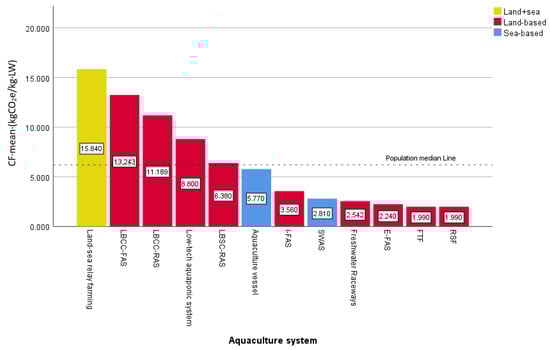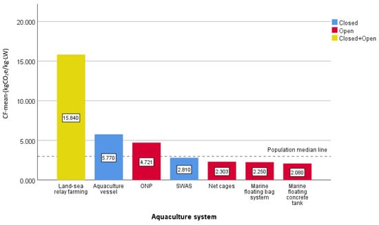 In Figure 4, the CF of large yellow croaker farming on an aquaculture vessel was determined to be 5.77 kgCO2e/kg LW, which was equivalent to the median value measured in group A samples and lower than the median value of the entire population of group A. Furthermore, it was significantly lower than the average CF value of Group A, as depicted in Figure 4’s comparison chart for CF values in Group A. These findings demonstrated that the CF of intensive closed aquaculture vessel systems was below the average level observed in closed aquaculture systems overall. However, when compared to SWAS, its CF was higher due to two main factors: firstly, SWAS was a semi-closed system floating on the sea surface with flowing water and with fixed walls, which could be considered a kind of aquaculture system between an ONP and a closed flow-through system; secondly, the installations of the SWAS were typically located in near-shallow sea areas where energy consumption tends to be lower.