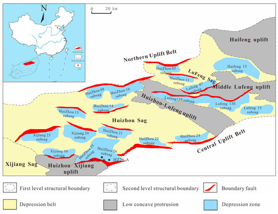 A geological map illustrating the spatial arrangement of tectonic units, the structural features along a profile within the Huizhou depression in the PRMB, and the precise geographic location of the Huizhou depression within the PRMB [26].