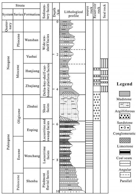 PRMB in the South China Sea, with its two-kilometer-thick layer of Eocene sediments, has emerged as a hotspot for oil exploration. Recent discoveries, like the HZ25-7 field in the Wenchang Formation, have fueled this interest [28]. PRMB, a Cenozoic rift basin stretching northeastward along the continental margin, is crisscrossed by three fault systems: NE-EW normal faults, NW shear faults, and WNW oblique-slip faults [33]. The Huizhou Sag, a shallow area on the continental shelf, has been studied previously. These studies classified the Cenozoic sediments in the Huizhou Sag into syn-rift and post-rift mega-sequences. The syn-rift sequence comprises the Wenchang and Enping formations, divided by the T70 breakup unconformity. The post-rift sequence includes the Zhuhai, Zhujiang, Hanjiang, Yuehai, and Wanshan formations. Figure 2 illustrates Huizhou Sag’s stratigraphy with details on petroleum potential, lithology, and sedimentary facies.