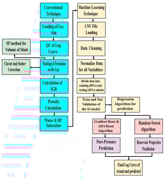 In recent decades, ML models have been used to predict petrophysical properties more precisely and efficiently because petrophysical properties are industry practice to evaluate the reservoir formation hydrocarbon potential and are further utilized to predict rock physics attributes [47]. The primary reservoir parameters porosity and permeability prediction have been achieved using ML and statistical regression tools in recent years. The use of conventional well-log data with the calibration of core measurements has become particularly effective. ML tools are widely used to accurately estimate reservoir properties, particularly permeability and porosity [48]. To create sophisticated predictive ML models for Pp prediction using petrophysical data [49]. The primary focus of the current study is on the best way to design and use ML models for petrophysical parameter estimation because they are further used to predict Pp.
