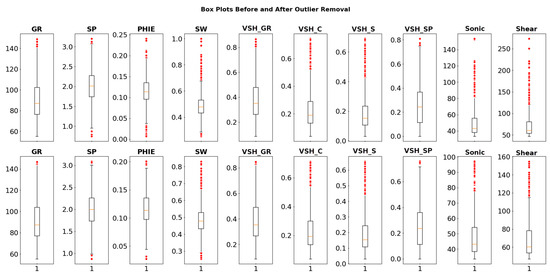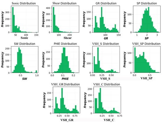 In ML techniques, the first step is frequency distribution, which assists in a better understanding of the parameters present in our selected reservoir formation. The frequency distribution chart was developed for petrophysics’ input and output parameters. The plot’s x-axis represents the original scale, and the y-axis represents the frequency distribution, illustrating the frequency range in which different data sets are present, as shown in Figure 5. A pair plot is shown in Figure 6 before the outlier is removed. Note that the outliers were removed by applying the absolute square method. The standard equation available literature was used to calculate the error parameters. The error was calculated by using Equations (13)–(15). A command was given to the code to generate the error parameters.