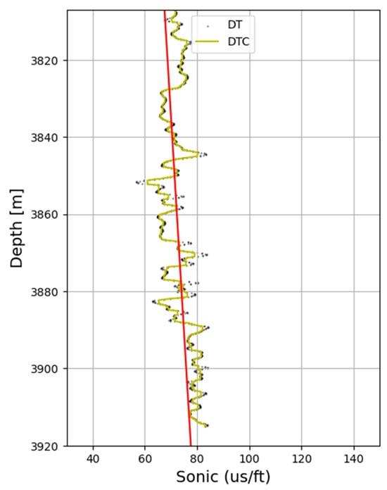 The normal compaction trend developed on the sonic log, representing the original DT with a black color, and compensates the sonic log (DTC) in a yellow color, and the red line shows the NCT line.
