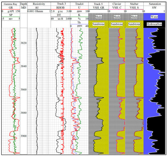 where is an Index Gamma Ray, GRlog is a log curve value obtained from the gamma-ray log, GRcln is the average minimum value of GR, and GRshl is the maximum value of GRlog. After the calculation of the , the Clavier and Steiber correction was estimated with the help of Equations (2) and (3) [36,37]. The estimation of shale volume through the linear approach, which is not based on geographical features (gamma-ray index), leads to the over-estimation of shale volume values. To reduce this, non-linear approaches have been developed that are more optimistic and reliable [33]. Clevier’s and Steiber’s non-linear approaches rely on geographical features or formation age to improve the accuracy and reliability of shale volume estimation in shaly sand reservoirs [38]. A literature survey revealed that the best estimation of shale volume is obtained using a gamma-ray log with the Stieber non-linear approach, which is calibrated with XRD in the tight reservoir [8]. Therefore, in the current study, we use Steiber’s approach to compute shale volume.