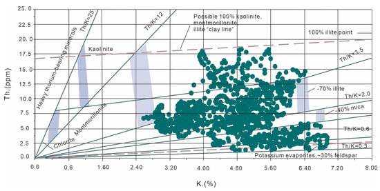 Many clay minerals, including kaolinite, illite, and chlorite, were found in tight sandstone reservoirs, and their presence significantly impacts the quality of the reservoir. The type of clay minerals was determined using a spectral gamma-ray (SGR) log [51,52]. The precise assessment of mineral composition is crucial for enhanced reservoir characterization. However, it presents significant difficulties in shale and tight units because of the intricate mineralogical structure, minimal porosity, and extremely low permeability. Lab measurements can be accessed more precisely [53]. The conventional practice used for the assessment of porosity is lab-based measurement of rock samples as well as traditional logging methods, which encounter constraints related to cost, and time. To address this limitation, a machine learning-based method has been employed for estimating porosity based on drilling data [47,54]. Figure 10 shows the cross plot between the potassium and thorium, representing the amount of minerals present in the reservoir formation.