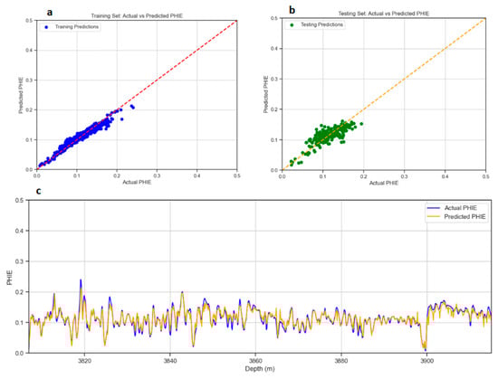 (a) The scatter plot of actual vs. predicted training data set points is shown in the blue color of effective porosity. (b) The scatter plot of testing data set points of effective porosity. (c) represents the actual vs. predicted PHIE, the x-axis represents the depth in meters, and the y-axis shows the PHIE result in percentages. The blue color indicates the actual curve that is calculated by the conventional method, and the orange curve is the predicted curve with the help of random forest techniques.