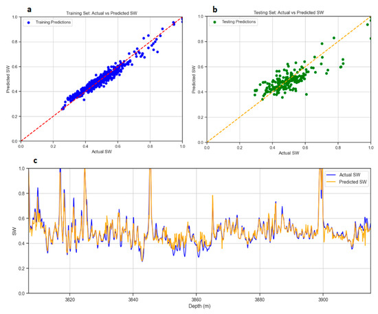 (a) The scatter plot of actual vs. predicted training data set points is shown in a blue color of the saturation of water. (b) The scatter plot of testing data set points of water saturation. (c) represents the actual vs. predicted SW, the x-axis represents the depth in meters, and the y-axis shows the SW result in percentages. The blue color indicates the actual curve that is calculated by the conventional method, and the orange curve is a predicted curve with the help of random forest techniques.