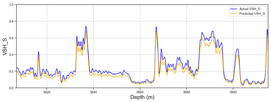 The figure represents the actual vs. predicted VSH, the x-axis represents the depth in meters, and the y-axis shows the result of VSH in percentages. The blue color indicates the actual curve that is calculated by the conventional method and the orange curve is the predicted curve with the help of random forest techniques.