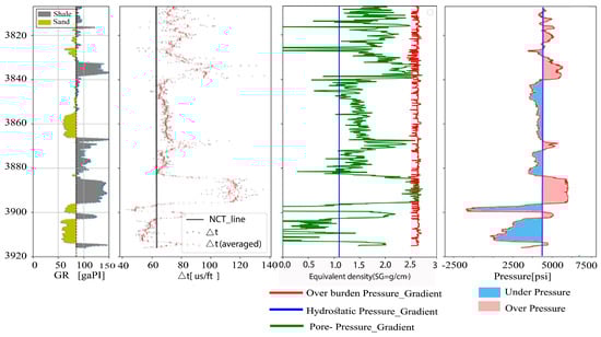 Δtm is the transit time in the shale matrix, Δtml is the transit time at the mudline (Z = 0), (Z is the true vertical depth below the mudline, (c is the compaction parameter, σe is the effective stress [46], pf is the pore pressure, ppg is the pore pressure gradient, σvgσ is the overburden pressure, phg is the hydrostatic pressure gradient, and Ppg is the formation pore pressure gradient [16,47].