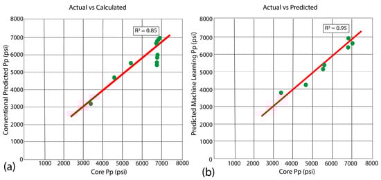 Core vs. predicted pore pressure with the help of conventional and machine learning techniques. (a) shows the pore pressure estimated by the conventional method in which R2 is 0.85. (b) demonstrates the pore pressure estimated by the ML method in which R2 is 0.95.