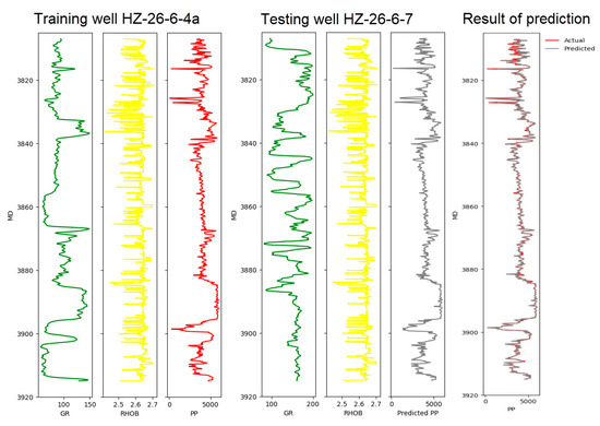 Three types of log curves. The first three tracks are the training well of HZ-26-A, the green color represents the GR log, the yellow shows the density log (RHOB), and the red and grey color represents the Pp. The extra regression algorithm is used to estimate the predicted Pp. The R2 score for the testing result is 0.98, which represents the best regression results. The grey Pp is predicted pore pressure on the well HZ-26-B.