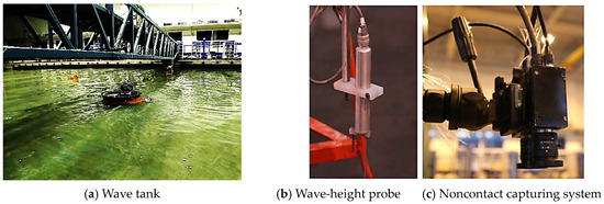 The model test was conducted in the multifunctional integrated basin of the State Key Laboratory of Coastal and Offshore Engineering of Dalian University of Technology, which has 40 m length, 24 m width, and 0.8 m depth, as shown in Figure 1a. Within this facility, the wave-height probe and noncontact optical capturing system, shown in Figure 1b,c, was used to measure the wave elevation and motion responses of the models in waves.