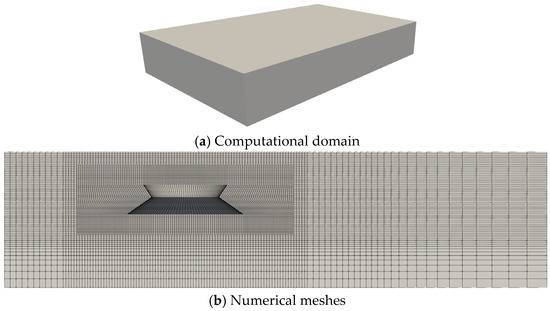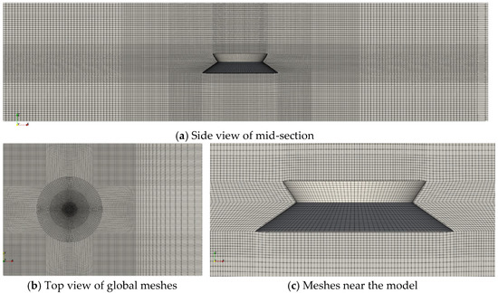 The mesh sizes for numerical models can be as follows. According to the study by Atkins et al. [30], when simulating the wave impact on floating structures, it is necessary to ensure the density of vertical grids and the aspect ratio of the grids. Specifically, there should be at least 10 layers of vertical grids within one wave height, and the aspect ratio of the grids should be maintained above 1:20. Therefore, in order to ensure sufficient computational accuracy, the numerical model in this study divides the vertical grids into 16 layers within one wave height. Meanwhile, the aspect ratio of the grids near the sandglass-type body is controlled to be around 1:1, while in the regions far away from the body, a transition to coarser grids is applied to improve computational efficiency.
