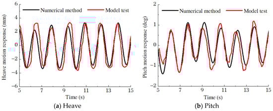 Then, under typical sea conditions, the time-history curves of heave and pitch motion responses of the sandglass-type floating model by the experiment and numerical methods can be shown in Figure 3. It is evident from the figure that the numerical simulation results are in good agreement with the experimental data. Furthermore, the values at various crests and troughs of the time-domain curves during the relatively stable stage (5 s~15 s) are listed in Table 4 and Table 5, facilitating a comparison between the numerical simulation and model test results. From the tables, it can be also seen that the numerical and experimental solutions are basically the same, which can effectively validate the accuracy of the numerical method in calculating the motion responses of the model.