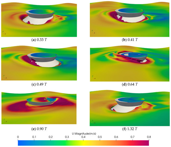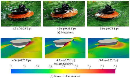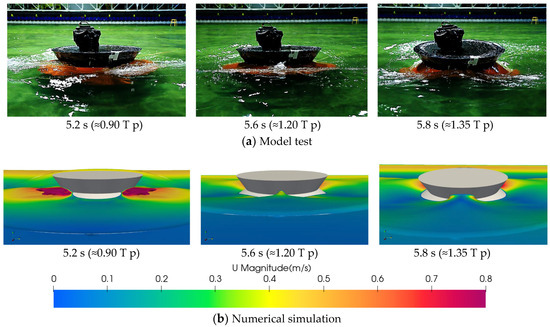 Moreover, a classic regular wave was generated, whose wave height and period were selected by referring to a significant wave height of 0.159 m and the peak period of 1.334 s of a once-in-five-years wave in the South China Sea [31]. Then, free surfaces near the sandglass-type model in the wave for the phenomena of slamming and convergence were numerically simulated and shown in Figure 4 and Figure 5. Therein, various classic moments after three waves can be selected for the comparison of slamming phenomena. It can be found from the figure that the numerical method can successfully reproduce the classic fluid phenomena during the slamming process of the sandglass-type model in waves.