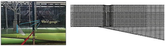 Here, the slamming case of a cylindrical model in waves was numerically simulated to prove the feasibility of the method established in Section 2.1 of this paper. The model test referred to Zhu et al. [28]. The experimental setup and the corresponding numerical meshes were shown in Figure 6. Therein, the slope and the cylindrical model is generated by the Snappy Hex Mesh toolbox in Open FOAM, and thus the meshes near the cylinder are refined to improve the capture precision of the free surface during the slamming process. According to the experimental set up, the regular wave used to simulate slamming on the cylindrical model has a wave height of 0.18 m and a period of 1.4 s.
