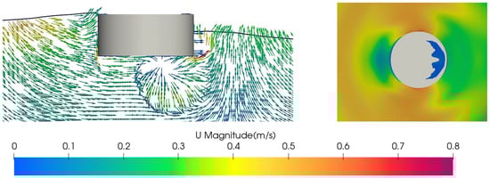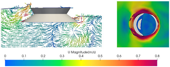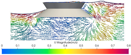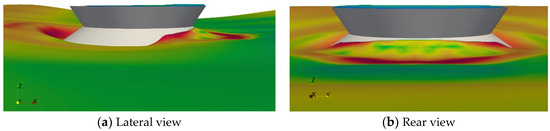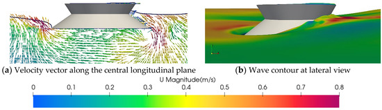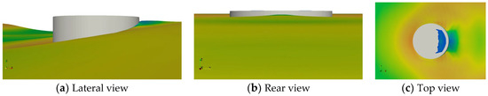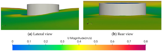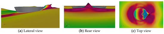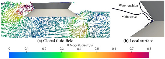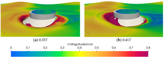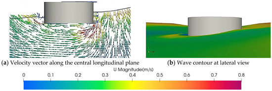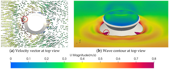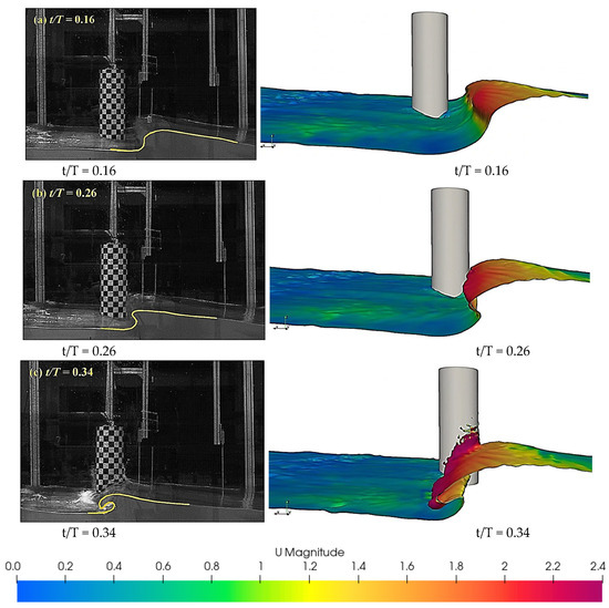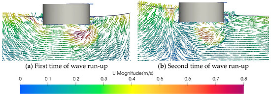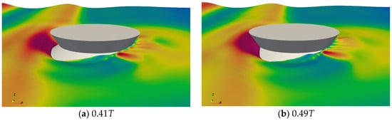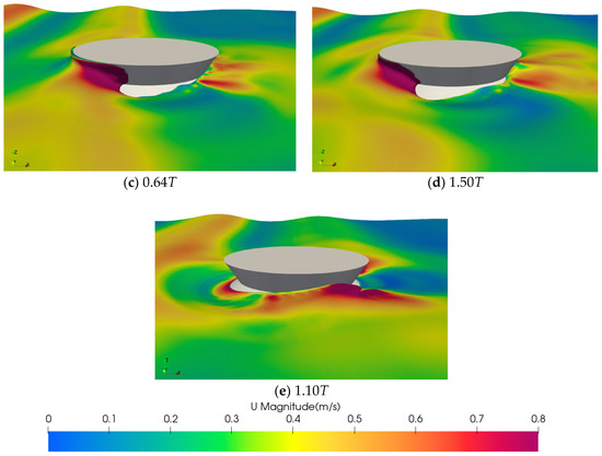 Moreover, compared to the long-wave condition, under the short-wave condition, the shorter wavelength results in less fluid gathering on the front surface of the model, meanwhile leading to weaker diffraction waves, as depicted in Figure 39c. It can also be observed that the weakening of the diffraction waves leads to a reduction in the height of the formed “rooster tail”, as shown in Figure 39d. Additionally, due to the shorter wave period, the side waves do not have enough time to return to the front surface of the model before encountering the incident waves of the subsequent period, as illustrated in Figure 39d. Therefore, unlike in long-wave conditions, there is no formation of reflux and water tongue. However, the shortened wave period also implies that as the fluid gathering on the front surface starts to go down, it may interact with the subsequent incident wave, resulting in a reduction in wave velocity, as depicted in Figure 39e. Consequently, this phenomenon of interaction leads to the attenuation of the first peak over time.