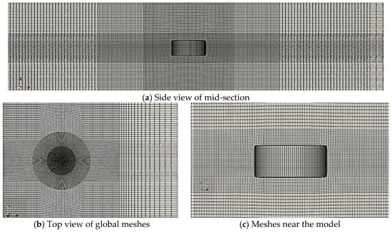 For contrast, a cylindrical body is also modeled, whose radius equals the RW of the sandglass-type model. Furthermore, the draft and freeboard of the two models are same, as shown in Table 9 and Figure 11. Numerical meshes in the computational domain can also be generated, as in Figure 12.