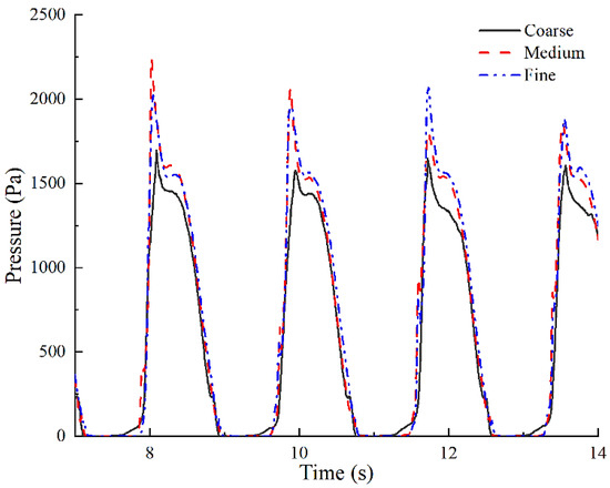 Similar to Section 2, mesh convergence of the numerical model is also examined. The numerical model established was employed to simulate wave slamming on the sandglass-type floating body. The monitoring point for the slamming pressure was positioned at the central intersection of the upper and lower floating bodies. The classic regular wave was selected for the wave simulation, with a wave height of 0.214 m and a period of 1.805 s. To validate mesh convergence, three types of meshes were used, as listed in Table 11. Here, N represents the total number of mesh cells, while Δ x, Δ y, and Δ z, respectively are the mesh sizes along the three coordinate axes.