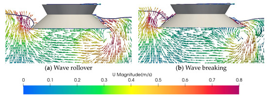 For the 3# secondary peak (10.14 s), as the subsequent wave keeps advancing, the wave goes up along the upper body, gradually increasing the thickness of the water cushion, until the reverse rollover occurs on the upper part of the wave. During the wave run-up, the fluid velocity decreases and the velocity direction is gradually perpendicular to the upper surface simultaneously. The secondary peak occurs and shows a weaker peak with a longer duration, which is associated with the incidence and reflection effects caused by the overall action of the wave. In this scenario, the global wave field and the time-history wave pressure are nearly reproducible.