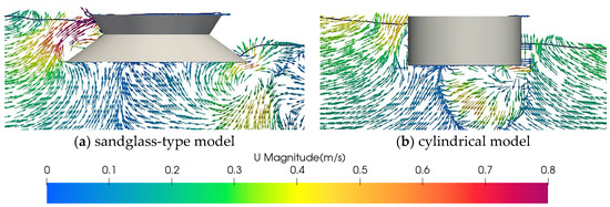 Velocity vector along the central longitudinal plane at first peak of the sandglass-type and cone-cylinder floating bodies.