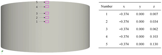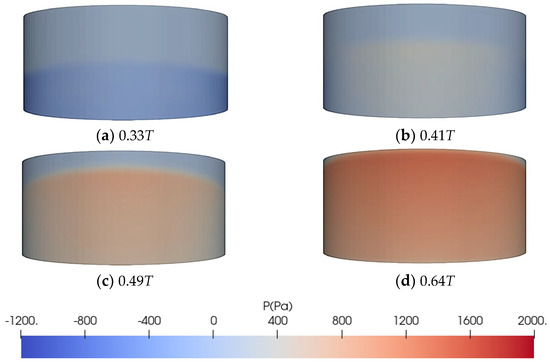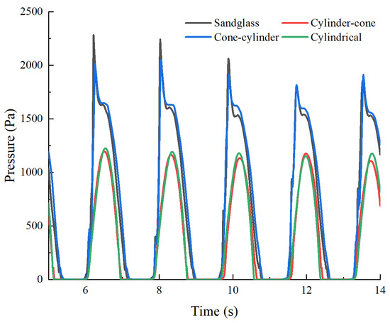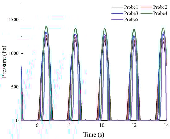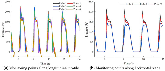 On the other hand, time-history curves of hydrodynamic pressures at various monitoring points for the cylindrical model are shown in Figure 36. Through comparative analysis, it becomes evident that the sandglass-type shape plays a great role in the evolution of hydrodynamic pressure, and thus can result in the pulsating characteristics of the slamming pressure. In contrast, the pressure on the surface of the cylindrical model does not exhibit this nonlinear behavior.