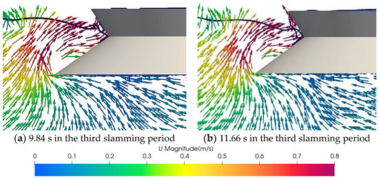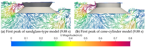 Let us begin by analyzing the first peak. As discussed earlier, the inclination of the lower floating body leads to significant horizontal velocity generation during wave ascent. Subsequently, the flare structure on the upper floating body of the sandglass-type model promotes a greater component of fluid particle velocity along the model’s surface compared to the cone-cylinder model, as depicted in Figure 43a,b. Consequently, the presence of the upper floating body’s flare contributes to intensified slamming and a larger first peak.