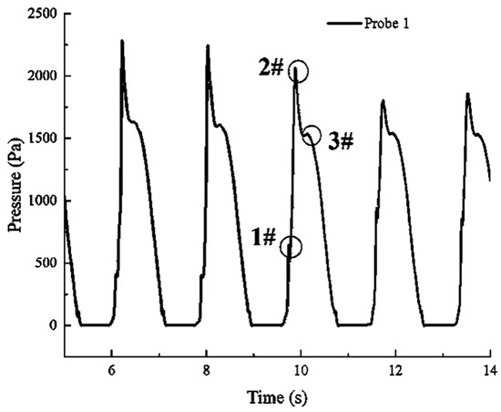 On this basis, for the sandglass-type model, slamming pressure at probe 1 is taken as an example to study the relationship between slamming phenomenon and slamming pressure, as shown in Figure 37. It can be seen that in a classic slamming period, there are three classic pressure peaks, which include 1# small peak (9.76 s), 2# main peak (9.88 s), and 3# secondary peak (10.14 s). Next, the generation mechanisms of each peak are discussed by analyzing the third slamming period (9~11 s).