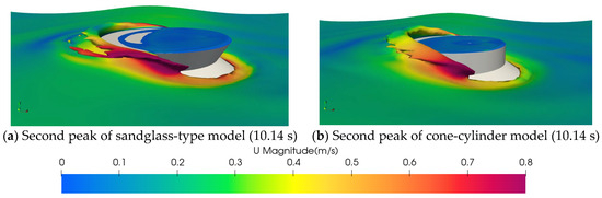 Now we are going to analyze the second peak. The second peak of the cone-cylinder model exceeds that of the sandglass-type model. This difference arises from the flare structure on the upper floating body, which weakens wave ascent and strengthens wave diffraction. In contrast, the upper part of the cone-cylinder model consists of a vertical cylinder, facilitating wave ascent rather than wave diffraction. Figure 44a,b provide a comparison of the wave surfaces at the second peak for both model types. It is evident that wave diffraction is more pronounced in the sandglass-type model, characterized by a higher diffraction velocity, while wave run-up is more prominent in the cone-cylinder model, resulting in a greater mass of water run-up. Consequently, the heightened wave diffraction leads to a smaller second peak for the sandglass-type model compared to the cone-cylinder model.