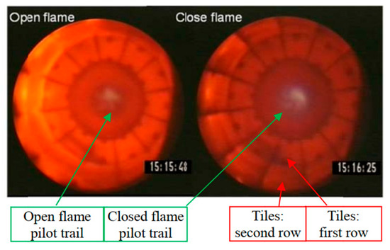 During the development of Ansaldo Energia’s coaxial multi-stage lean premix burner, an obvious sudden change in flame shape occurs during loading, and an inverse sudden change takes place during deloading, which is recognized as “flame transition” or “flame switch” [16,38]. As depicted in Figure 2, the left side shows the flame image before the flame transition at the end of the flame chamber during the test, while the right side illustrates the flame image after the flame transition from the same perspective. Before the flame transition, the first and second row ceramic tiles near the burner outlet are brighter, indicating a higher temperature in this region. After the flame transition, the color of the first and second row ceramic tiles turns crimson, indicating a lower temperature. Additionally, the trails of the pilot flame in the left image are open, whereas they are closed and slightly rolled around the chamber centerline in the right image. Rofi et al. [16,38] employed both experiments and Reynolds Averaged Navier–Stokes (RANS) simulations to explore the flame shape before and after flame transition in a single burner combustion chamber developed by Ansaldo Energia. Their findings revealed distinctive flame shape transitions during load ramps, providing valuable insights into the dynamics of combustion stability and emission characteristics of their gas turbine combustor.