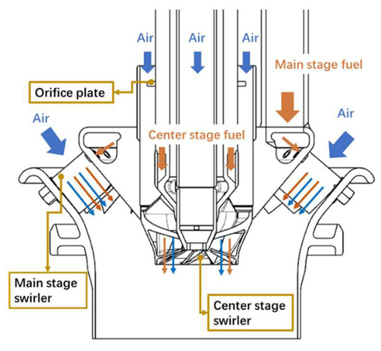 Most Aegean island electric power plants use gas turbines almost exclusively as power units [1]. Lv et al. [7] also proposed a gas turbine island energy system burning biomass gas with an electrical efficiency of 60.78%. With the continuous advancement of advanced, efficient, and clean gas turbine combustion technologies [8], coupled with increasingly stringent emission regulations [9,10], the development of the gas turbine encounters new challenges and demands, including the imperative to simultaneously achieve for higher efficiency, lower NOx and CO emissions, greater fuel flexibility, and a larger operation window [11,12]. The wider operation window is characterized by lower park loads [13], indicating the operational state of the gas turbine at lower loads, and higher ramp gradients, denoting a greater rate of change when adjusting the load, which showcases the greater flexibility and adaptability of gas turbines various operational conditions [14,15,16]. Specifically, increasing the equivalence ratio to enhance combustion is very effective in extending the operation window. Nevertheless, this results in a trade-off—an increase in NOx emissions, posing challenges to the goal of achieving lower emissions. Consequently, it can be concluded that addressing the challenge of extending the operational window for the heavy-duty gas turbine combustor while simultaneously ensuring stability, efficiency, and environmental friendliness is crucial.