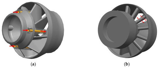 Figure 4 depicts the general burner configuration used in this study. The burner consists of a central stage positioned at the center and a main premix stage located at the periphery. Most of the air and fuel enter the combustion chamber through the main premix stage for combustion. Both the central stage and the main premix stage contain a swirler, with the central stage swirler being an axial swirler and the main premixed stage swirler being diagonal. An orifice plate is installed upstream of the central stage to adjust the air flow area in the central stage. In the main premix stage, air enters the burner upstream of the diagonal swirler blade, while the fuel enters the fuel cavity through the pipeline and is then injected from the holes on the blade, forming a transverse jet to enhance the mixing. For the central stage, air enters through the annular gap formed by the orifice plate and the peripheral circular tube before entering the channel of the swirl blade. There are two different injection modes for the central stage fuel. One is injected from the pipe between the swirler blades (Figure 5a) and is aligned with the direction of airflow to prevent the formation of a transverse jet, resulting in a poor mixing effect. This mode is referred to as non-premix central stage (NPCS). Another injection mode involves fuel injection from the holes on the axial swirler blade (Figure 5b), directed perpendicular to the incoming airflow, which forms a transverse jet to enhance mixing. This model is called the premix central stage (PCS). A modified injection mode, premix central stage enhanced (PCSE), is similar to PCS, but without the orifice plate to increase the air into the central stage so as to improve the mix quality between the fuel and the air. This article explores the influence of central stage combustion mode and fuel split between the main stage and the central stage on the flame transition by testing three different configurations (NPCS, PCS, and PCSE). The fuel used in the test is natural gas.