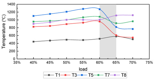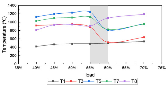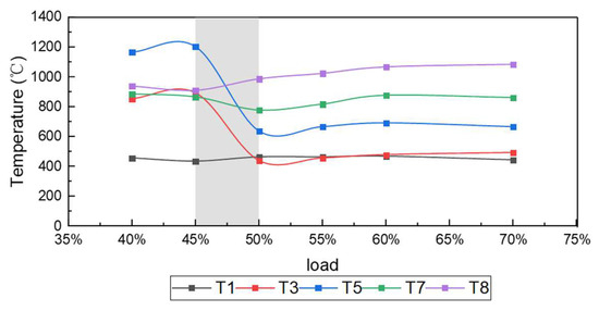 Figure 7 shows the temperature variation with the load change monitored with thermocouples at different positions of the NPCS burner. It can be noted that T1, located upstream of the chamber close to the burner outlet (seen in Figure 6), exhibits a relatively small variation with load. T3 and T5, positioned in the middle of the chamber, experiences a slight temperature increases during the process of 40% to 45% load due to the increase in the global equivalence ratio, followed by a significant decrease in temperature amounting to nearly 500 K during the process of 45% to 50%, and a gradual rise as the load further increases. At the downstream of the combustion chamber, T7 undergoes a slightly decrease during the 45% to 50% process, then gradually increases with the further load increase. Meanwhile, T8 shows a gradual increase with the increase of load.