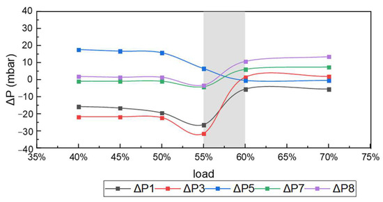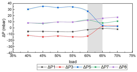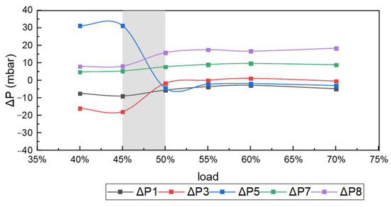 Figure 8 illustrates the variation in differential pressure, with the load measured at different positions. ΔP1, positioned upstream of the chamber near the burner inlet, exhibits a relatively small variation with load. In addition, the differential pressures ΔP3 and ΔP5, situated in the middle of the chamber, exhibit nearly constant values during the process of 40% to 45% load. However, in the process of 45% to 50% load, ΔP5 undergoes a significant decrease, and its value changes from positive to negative, while ΔP3 significantly increases with the load. At load > 50%, the differential pressures ΔP3 and ΔP5 remain stable with the increasing loading. The differential pressures, ΔP7 and ΔP8, situated downstream of the combustion chamber, both exhibit a slight increase with the increase in load.