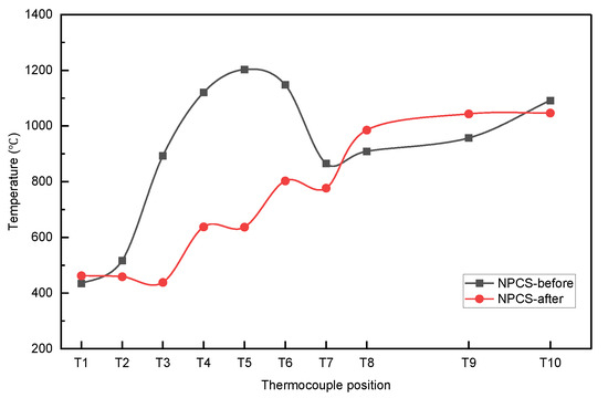 It is noteworthy that that T3 and T5, as well as Δ P3 and Δ P5, display great changes during 45% to 50% load, indicating substantial alterations in the combustion chamber. Therefore, the near-wall temperature distribution along the axis was extracted for 45–50% load, as shown in Figure 9. NPCS-before represents the condition at 45% load, and NPCS-after indicates the condition at 50% load. At 45% load, the temperature in the middle of the combustion chamber significantly rises, forming a prominent protrusion. Meanwhile, the temperature decreases significantly from T6 to T7. In general, the temperature distribution shows a pattern of high in the middle and low on both sides along the axis. At 50% load, in the middle of the combustion chamber, the temperature distribution is relatively smooth, and increases in a stepped pattern along the axial direction, while the temperature shows minimal changes along the axial direction downstream of the combustion chamber. This indicates a noticeable change in the flame shape changes, temperature distribution, and differential pressure as the load increases from 45% to 50% load, which signifies a flame transition. For NPCS, the thermocouples measuring showing significant temperature changes before and after the flame transition, which are T3~T6.