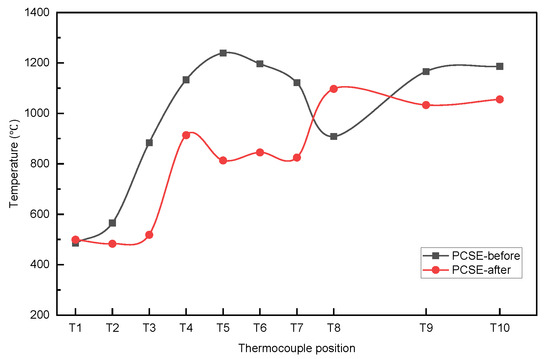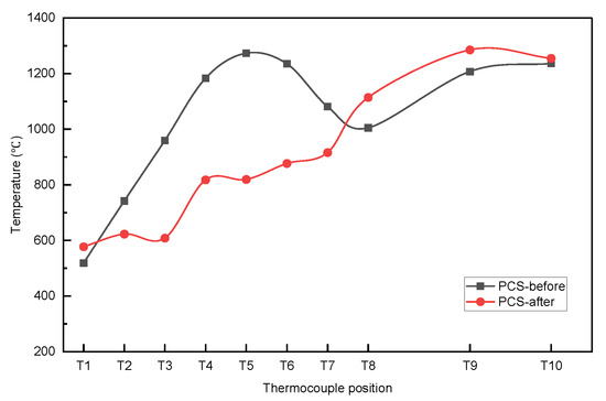 Figure 12 shows the near-wall temperature distribution along the axis before and after the flame transition for the PCS burner. The distribution pattern of the flame before and after transition is similar to that of the NPCS burner. Before the flame transition (at 60% load), there is a significant protrusion in the near-wall temperature distribution at the midstream of the combustion chamber (T1–T7), and the near-wall temperature distribution becomes smoother at the downstream of the combustion chamber (T8–T10). After the flame transition (at 65% load), the near-wall temperatures T1–T9 increase gradually along the axial positions, but then the temperature slightly decreases. For the PCS burner, the thermocouples measured indicate significant temperature changes before and after flame transition, which are T3~T7. And compared to the NPCS burner, T7 has a more significant temperature change before and after the flame transition.