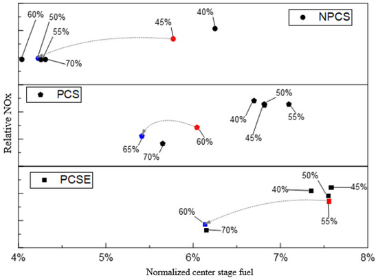 Figure 16 depicts the influence of central-stage fuel on the NOx emission under various loads for the three tested burners; the central-stage fuel quantity is normalized by the total fuel at the design point. Notably, the quantity of the central stage fuel under different loads shown in the Figure represents the value that achieves the lowest NOx emissions while maintaining stable combustion. For the load ranging from 45% to 70%, the variations in the quantity of central stage fuel are evident among the three tested burners. As illustrated above, the central-stage combustion mode differs among the three burners. Specifically, the NPCS burner adopts a diffusion combustion mode, resulting in a higher temperature that promotes the formation of NOx. Conversely, the central-stage combustion mode of PCS burner is premix combustion. As a result, the mixing quality of the central stage for PCS is significantly enhanced. This improvement results in a reduction of the central-stage flame temperature, thereby contributing to the mitigation of NOx emissions. To achieve low NOx emission, the central-stage fuel quantity of the NPCS burner is lower than the PCS burner, with the difference becoming more pronounced at high load (60% to 70%). Conversely, by removing the orifice plate to increase the air mass flow rate of the central stage so as to enhance the mixing quality further, the central-stage fuel is higher than the PCS burner, and the NOx emissions of the PCSE burner are slightly smaller compared to that of PCS.