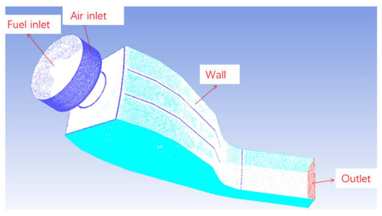 The numerical simulation was performed using the widely used combustion simulation software Fluent 14.0. The polyhedral mesh, with a total mesh number of 8.29 million, was used, and three prismatic layers were added at the fluid–solid interface in order to accurately evaluate the flow near the wall. The computational domain is shown in Figure 17; the types of air inlet boundary condition and fuel inlet boundary condition are the mass flow inlet, while outlet boundary condition is assigned as the pressure outlet. Both the top and bottom walls are adiabatic with additional cooling air slots, employing mass flow inlets for the cooling air. The side wall adopts periodic boundary conditions. In this study, the interior of the combustion chamber is a strong swirl with shear flow, so the turbulence calculation uses the realizable k-ε model with scalable wall function. The realizable k-ε model adds rotation and curvature-related items to the turbulence viscosity calculation, so it can provide superior performance for flows involving rotation and recirculation and ensure the accuracy of the numerical calculation results. The combustion model adopted the partially premixed combustion model and chemical equilibrium models. The Partially Premixed Combustion (PPC) system combines both the concept of a non-premixed model and a pre-mixed model in Ansys Fluent. It solves a transport equation for both the mean reaction progress variable C (to determine the position of the flame front) and the mean mixture fraction f (and its variance f’). The Chemical Equilibrium model assumes that the species are in a state of dynamic equilibrium and that the details of chemical kinetics are neglected. With the Chemical Equilibrium model, fuel properties are calculated through non-adiabatic equilibrium calculation and they only depend on mean mixture fraction, mixture fraction variance, and enthalpy levels. In this study, the SIMPLE algorithm is used for the coupling of speed and pressure, and the discreteness of the governing equations adopts the second-order precision upwind interpolation format. The boundary condition was consistent with the experiment.