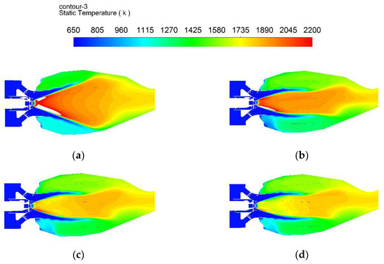 In this study, the effect of the central-stage fuel quantity on the temperature field using the PCS burner was explored. Figure 18 shows the temperature counters of PCS burner under different central-stage fuel quantities in a cross-section plane. Here, CSF means central-stage fuel, which is normalized by the total fuel at the design point. When the CSF decreased from 10% to 8%, a significant change occurs in the temperature distribution. And the flame angle became much smaller, accompanied by a decrease in the temperature within the central recirculation zone. Further decreasing the central-stage fuel, the flame angle remained almost unchanged, while the temperature within the central recirculation zone gradually decreased further.
