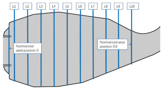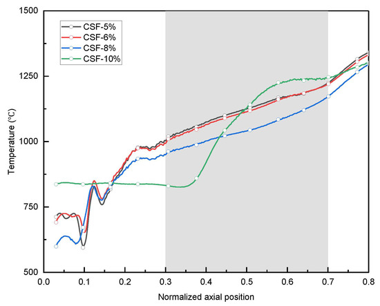 Figure 19 shows the axial position in the chamber, and the near-wall temperature variation along the chamber axis is shown in Figure 20. When the CSF decreases from 10% to 8%, the near-wall temperature and its distribution trend along the axis show a significant change. At CSF = 10%, the near-wall temperature exhibits a slight decrease as the axial position increases when positions ≤ 0.3. Subsequently, as the axial position rises from 0.3 to 0.6, the near-wall temperature undergoes a rapid increase from 850 °C to 1230 °C. Then, as the axial position continues to increase up to 0.8, the near-wall temperature experiences a gradual rise. At CSF ≤ 8%, due to the flame transition, the overall distribution trend of the near-wall temperature remains stable; however, significant variations are apparent when compared to the conditions at CSF = 10%. At axial distances ≤ 0.15, the near-wall temperature exhibits a fluctuating upward pattern due to the influence of the cooling air from the combustion chamber heat shield. At axial distance > 0.15, the near-wall temperature steadily increases with the axial distance. Notably, the near-wall temperature and distribution trend remain almost unchanged as CSF changing from 6% to CSF = 5%, while at CSF = 8%, it is relatively lower than those at CSF = 5–6%.
