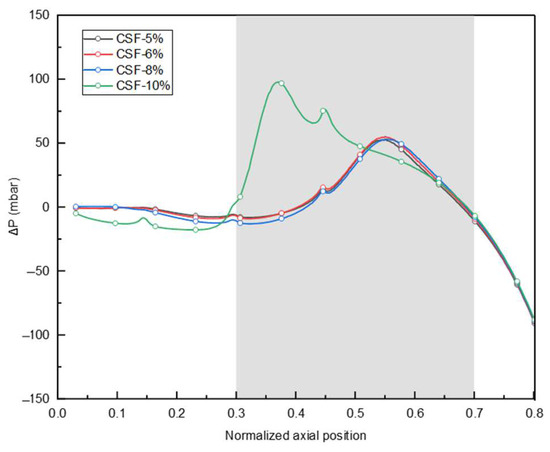 Figure 21 illustrates the distribution of differential pressure along the axis of the combustion chamber for the PCS burner under various central-stage fuel quantities; the static pressure in the 0 position (as shown in Figure 19) is the reference value for calculating the differential pressure, which is consistent with the experimental test. As was similarly observed in the experimental measurement, there was a notable decrease in the differential pressure and its distribution patterns in the midstream of the combustion chamber when CSF decreased from 10% to 8%, which could be attributed to the significant change in the flame shape. At CSF ≤ 8%, minimal changes are observed in both the differential pressure and its distribution trend, as the flame morphology remains virtually unaltered.