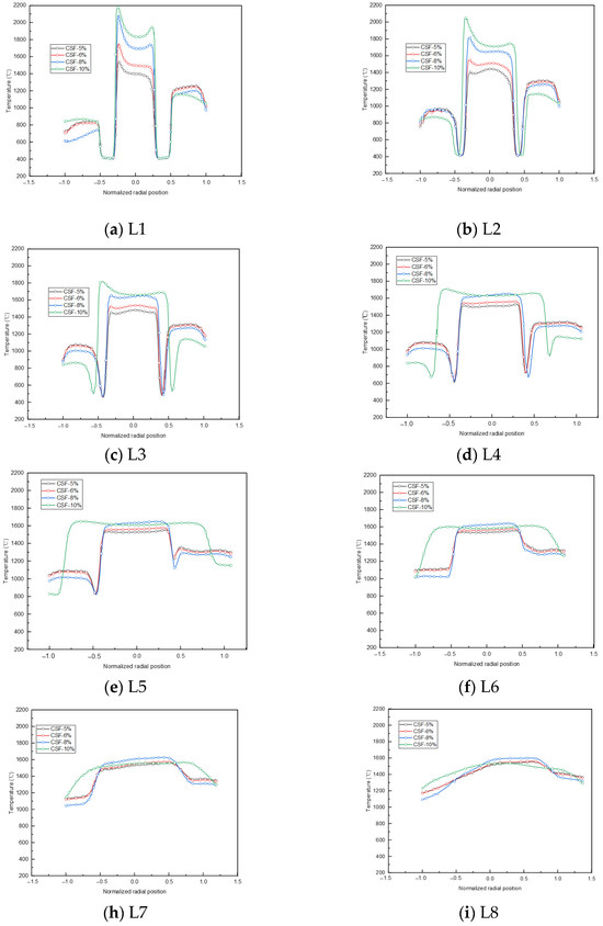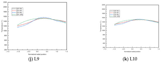 Figure 22 shows the radial temperature distribution at different axial positions. At L1 near the burner outlet, both the flame angle and temperature distribution remain consistent for different CSFs, except for a great temperature difference in the central recirculation zone. At L1 near the burner outlet, both the flame angle and temperature distribution remain consistent for different CSFs, except for a great temperature difference in the central recirculation zone. Here, an increase in CSF corresponds to elevated temperatures due to the heightened enrichment of central fuel. In addition, a gradual decrease in CSF results in a reduction in temperature in the central recirculation zone. L2 and L3 are located upstream, where the flame angle begins to differ. While L4~L6 is positioned in the midstream of the combustion chamber, as the CSF decreases from 10% to 8%, there emerges a substantial difference in temperature distribution, with a sharp expansion of the central recirculation zone and a significant increase in temperature in the corner recirculation zone. L8 and L9 are situated near the outlet of the combustion chamber, where the combustion is sufficient, thereby they are less affected by the recirculation zone. The temperature distribution remains consistent under different CSFs. Further decreasing the CSF from 8% results in unchanged temperature distribution at different axial positions, with differences in temperature between the central recirculation zone and the corner recirculation zone.