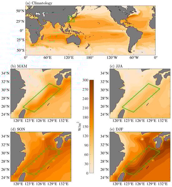 Figure 1a shows the climatology features of LHF over the global ocean between 60° S and 60° N. It is evident that the Kuroshio and Gulf Stream regions are the main areas for LHF release in the Northern Hemisphere. This article mainly focuses on the Kuroshio region in the ECS (the green box in Figure 1a). Figure 1b–e show seasonal climatology for the four seasons in the ECS region. The spatial distribution is inhomogeneous, and the large values are along the Kuroshio axis (green box in Figure 1b–e), implying that the LHF has a strong relationship with the Kuroshio, which is in good agreement with previous studies [42,43,44].